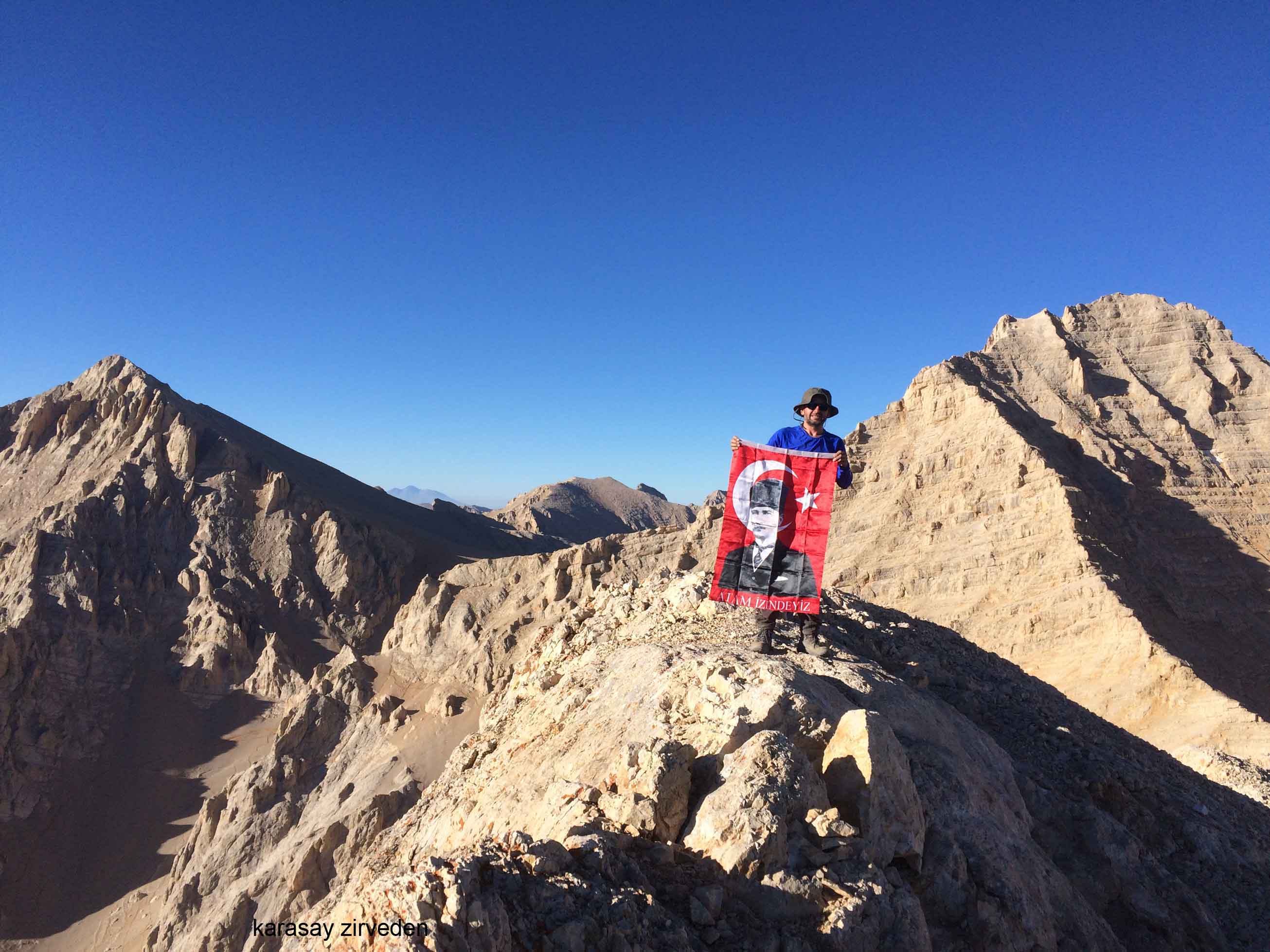 Öncü kuvvet Dursun hocaKarasay zirvesine varıyor. Zirvenin güvenli olduğu teyit edildikten sonra ben ve Oğuzhan sırasıyla zirveye varıyoruz. Fotoğraf ve kısa bir dinlenmeden sonra yolumuza devam ediyoruz. Düzeni asla bozmuyoruz, asker disiplini ile aşağı yukarı birer dönüm arayla ilerliyoruz ancak sadece adım atmaya çalışan birer yaratık halini alıyoruz, Dursun hoca hariç 😊