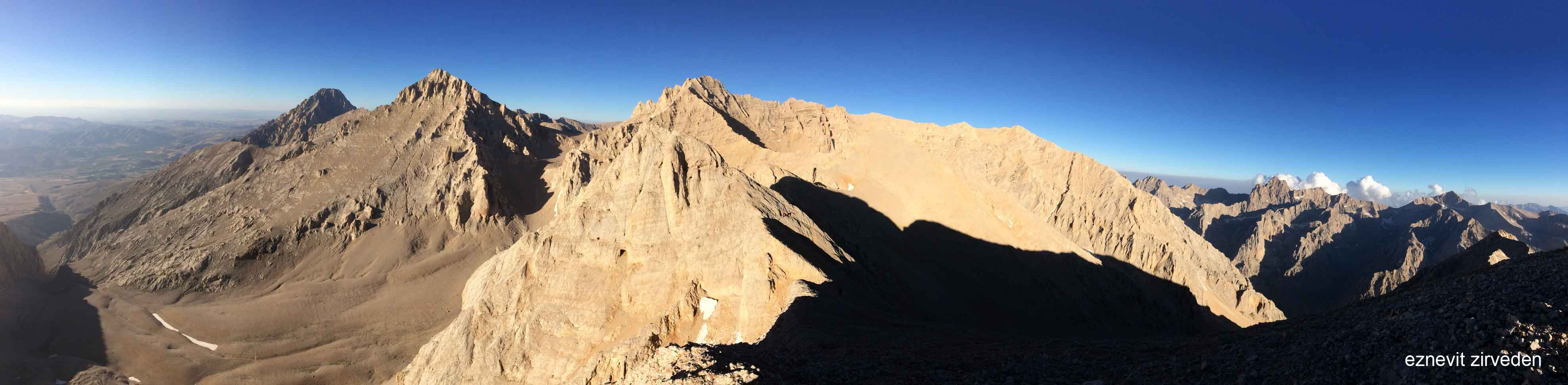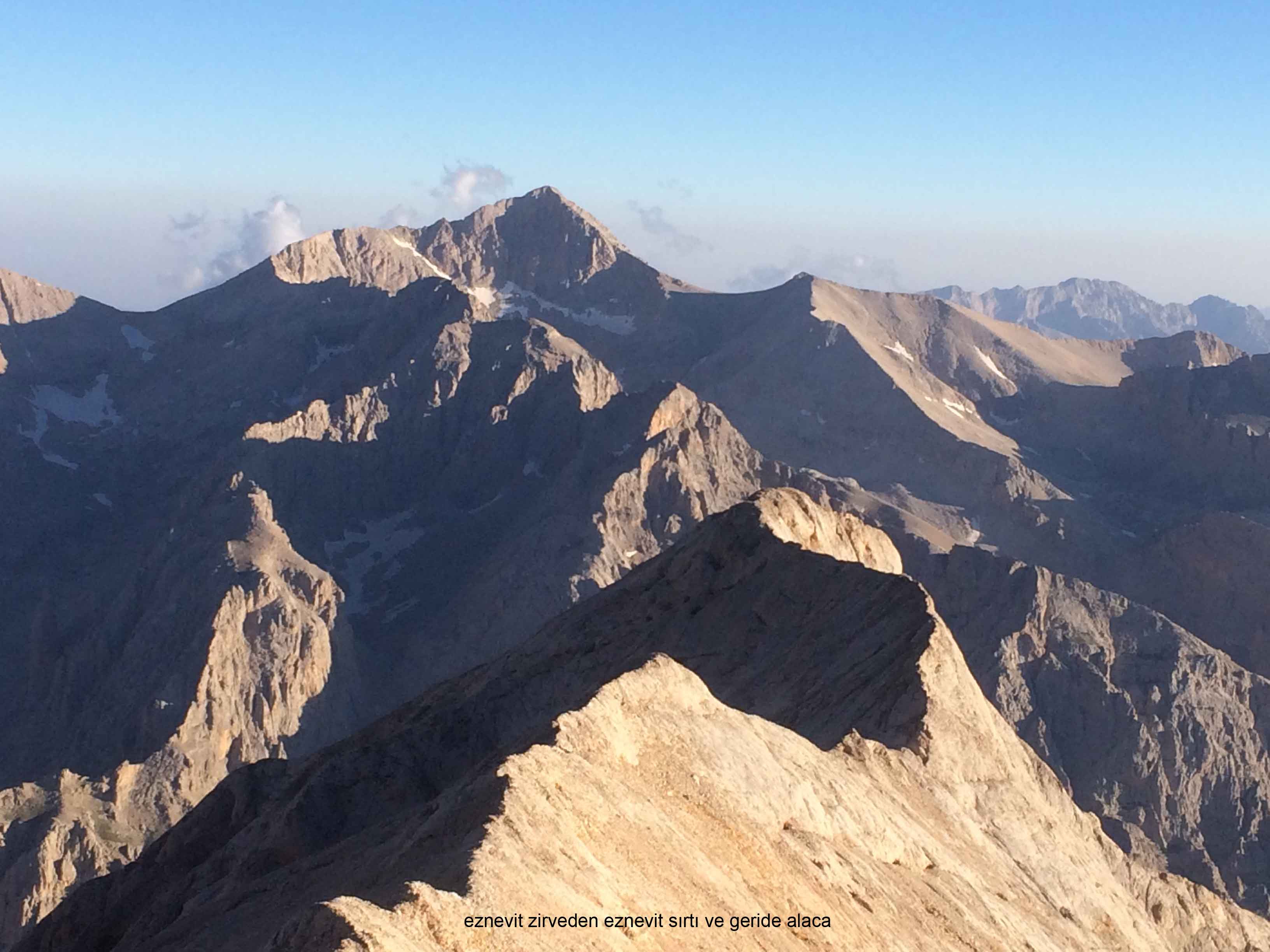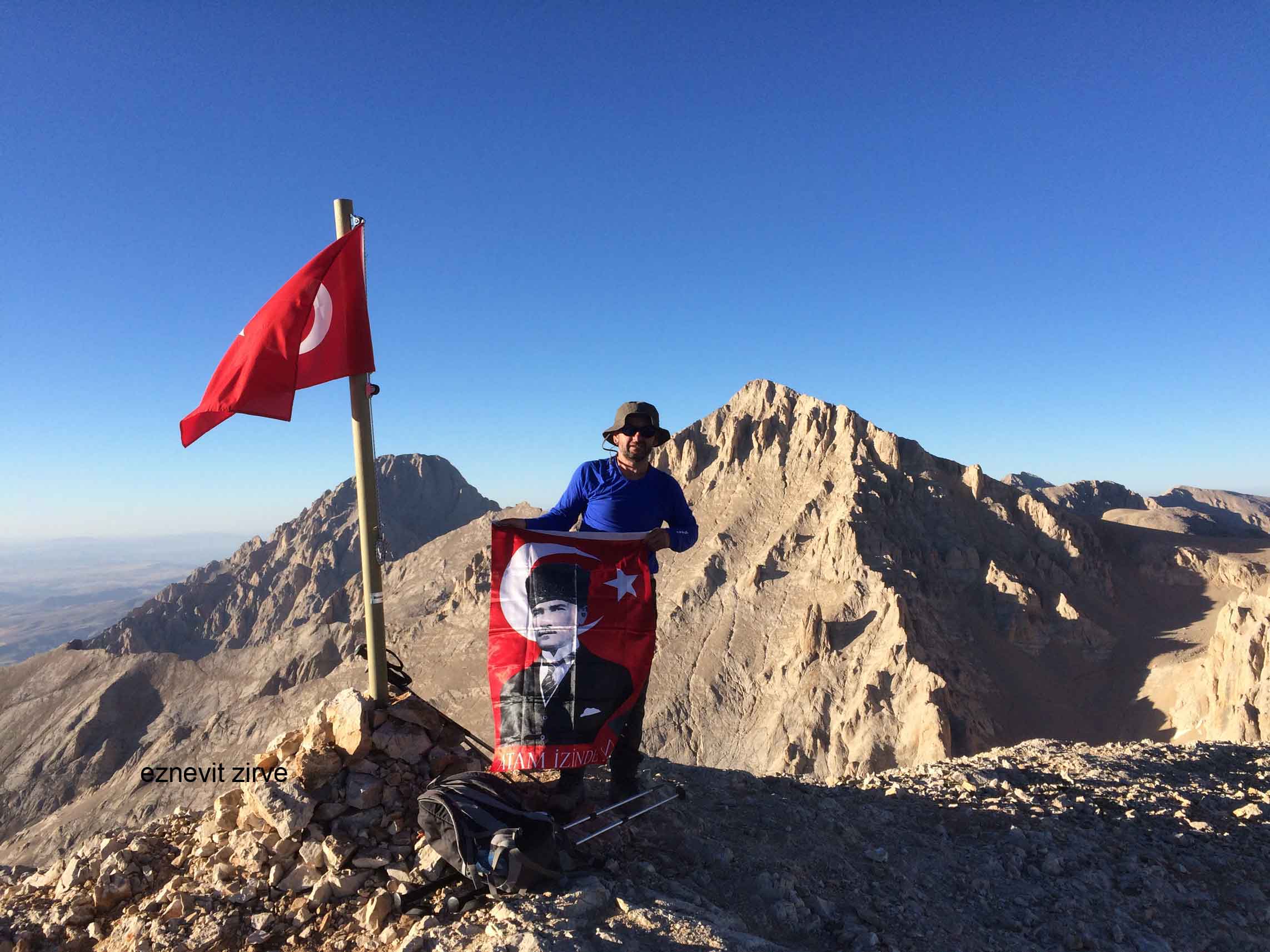 Ve gün batmadan Eznevit zirveye ulaşıyor, faaliyetimizin beşinci doruğuna adım atıyoruz. Nihayet planımıza göre başka çıkılacak doruk kalmadı artık ineceğiz…Birbirimizi beşinci kez tebrik ettikten sonra inişe geçiyoruz, inişte birbirimize yakın gidiyoruz. Hava halen aydınlık hatta karanlığın çökmesine en az bir saat var. Hızlı hareket etmeye çalışıyoruz ancak öyle yorgunluk çöktü ki artık adım atmıyor kendimizi bayır aşağıya salıyoruz. Dursun hoca hariç…