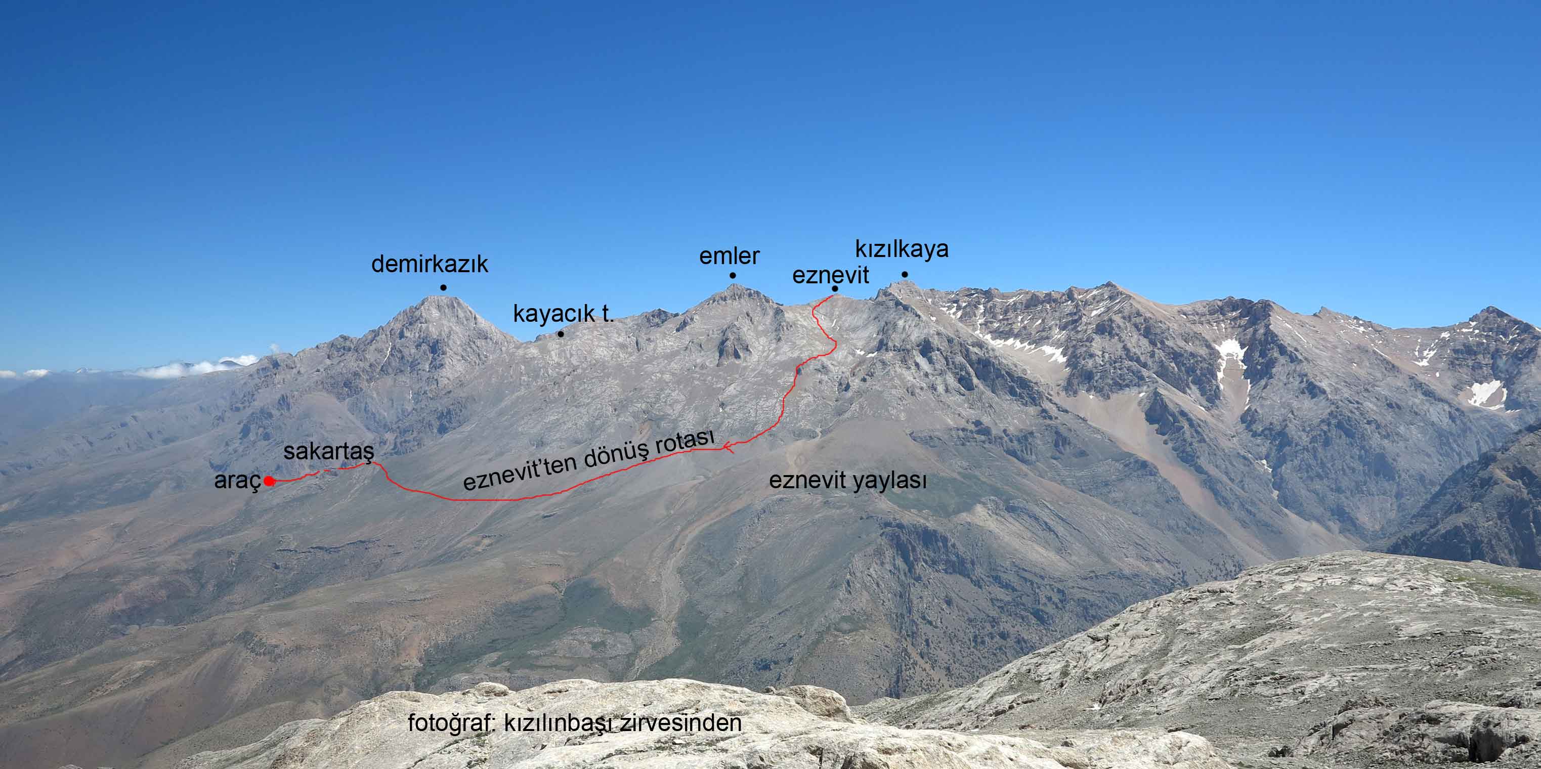 Emler zirvede konuşurken acaba Karasay ve Ezneviti de yapıp, Eznevitin güney yamacından inip araca varsak olur mu ki diye sohbet esnasında konuştuk. Önceliğimiz Kızılkaya’ya çıkabilmek sonrasında vakit ve derman kalırsa bakarız deyip inişe geçtik.