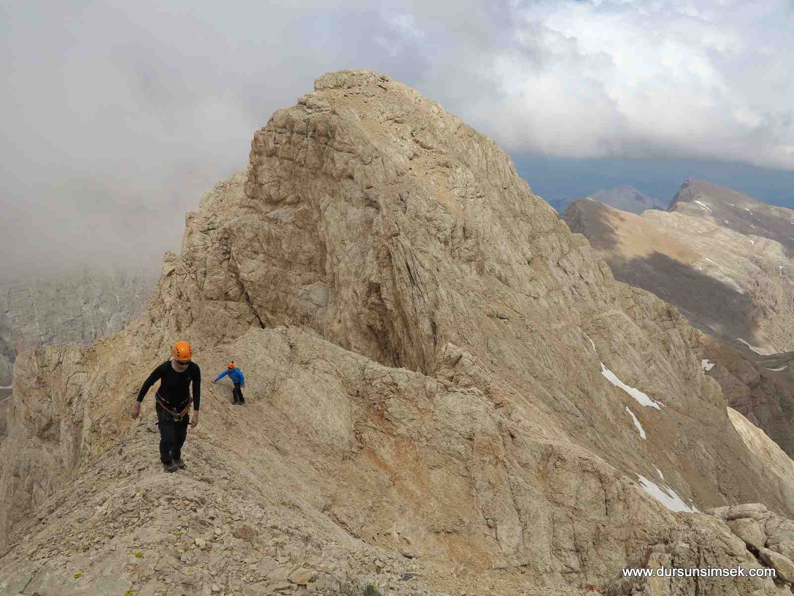 Sobek kamp yerinden Hacer boğazına giden patikaya girdik. Patikanın düzleştiği geniş alandan sağa girerek sırta girdik. Hacer boğazını gören sırtı takip ederek tırmanışın başladığı yüzeye geldik. Bu mesafeyi yaklaşık iki saatte aldık. Duvarda su akmış koyu bölgelerin yakınlarını takip ettik. İlk etaplarda karşımıza kelerde çıktı. Zorluk derecesi 2-3 olan yerlerden geçip zirve sırt hattına çıktık. Sırt hattının sol tarafında Mamerdiğin ve Orta kayalar, sağ tarafta Kızılyar sırt hattı ve karşıda vayvay tepe ile boruklu sırt hatları gözükmektedir. Aşağıdaki vadi ise Tekmezardan Karagöle gelen vadidir. Bizler birinci ve ikinci zirvelere sorunsuz çıktık. Üçüncü ve ana zirveye ise teknik malzeme kullanarak çıktık. Üçüncü zirve kılçıklı ve çürük sırt hattından oluşmaktadır. Çıkışta bir yerde ip açtık. Dönüşte ise iki yerden ip inişi yaptık. Zirvede ilk ip inişinde babadan büyük bir perlon kullandık. 60 metrelik ipin 30 metrelsiyle iniş yaptık.İkinci yerde ise sikkeden 15 metrelik ip inişi yaptık. Dönüşü aynı yerden hızlı bir şekilde inerek tamamladık. Duvardan sırta çıkan başlangıç yerinde keler bulunmaktadır. Dönüşte bu kelerde yağmurun dinmesini bekledik.